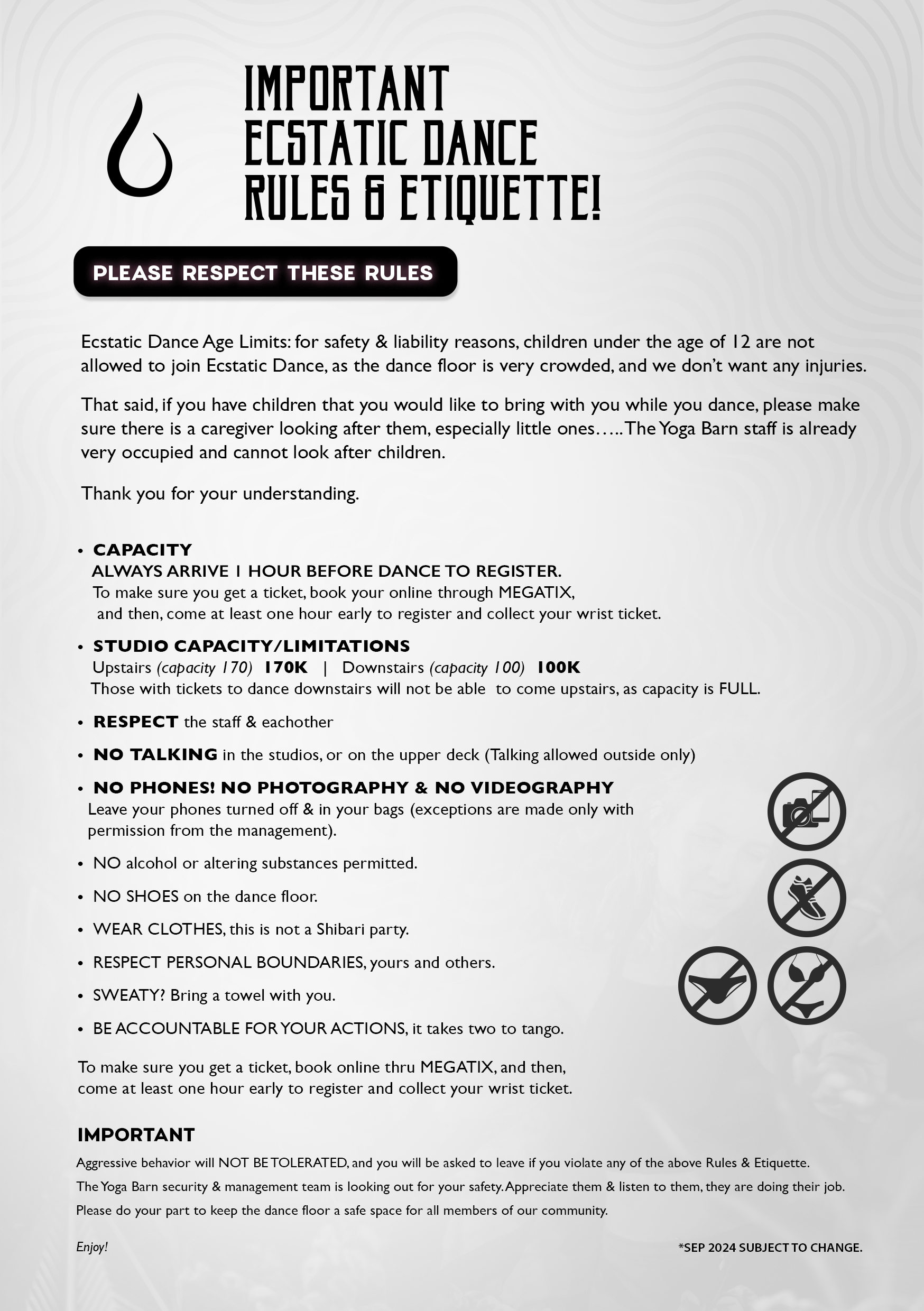 That said, if you have children that you would like to bring with you while you dance, please make sure there is a caregiver looking after them, especially little ones….. The Yoga Barn staff is already very occupied and cannot look after children.
